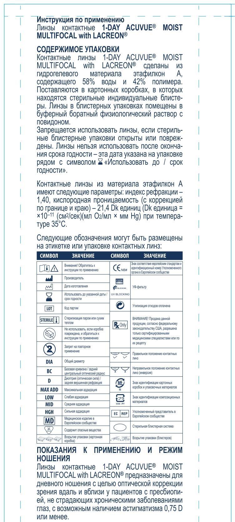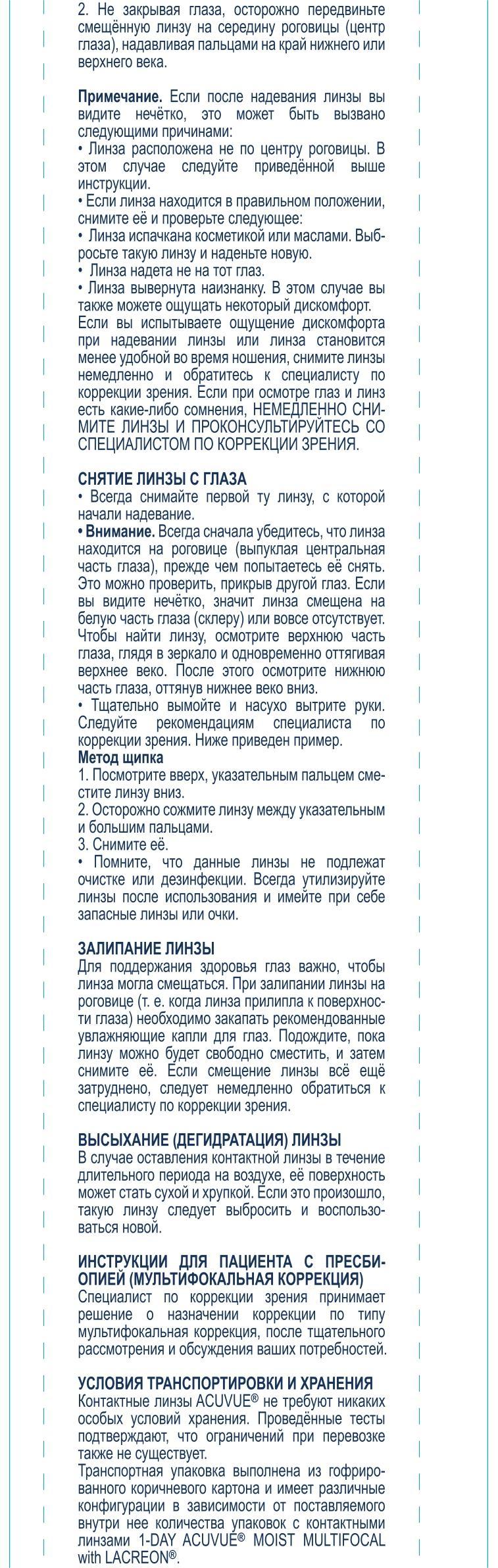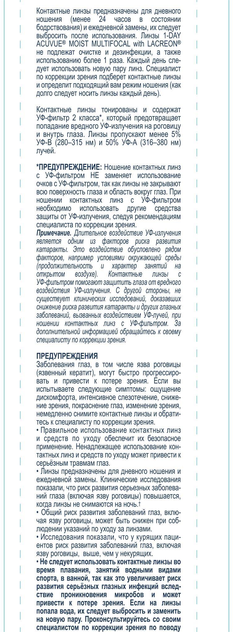 1-DAY ACUVUE MOIST with LACREON не содержат силикон и подходят для тех, у кого бывает сезонная и другие типы аллергии. Однодневный формат 1-DAY ACUVUE MOIST MULTIFOCAL обеспечивает простоту ухода, чистоту, эффективность, многозадачность и гигиеничность каждый день.