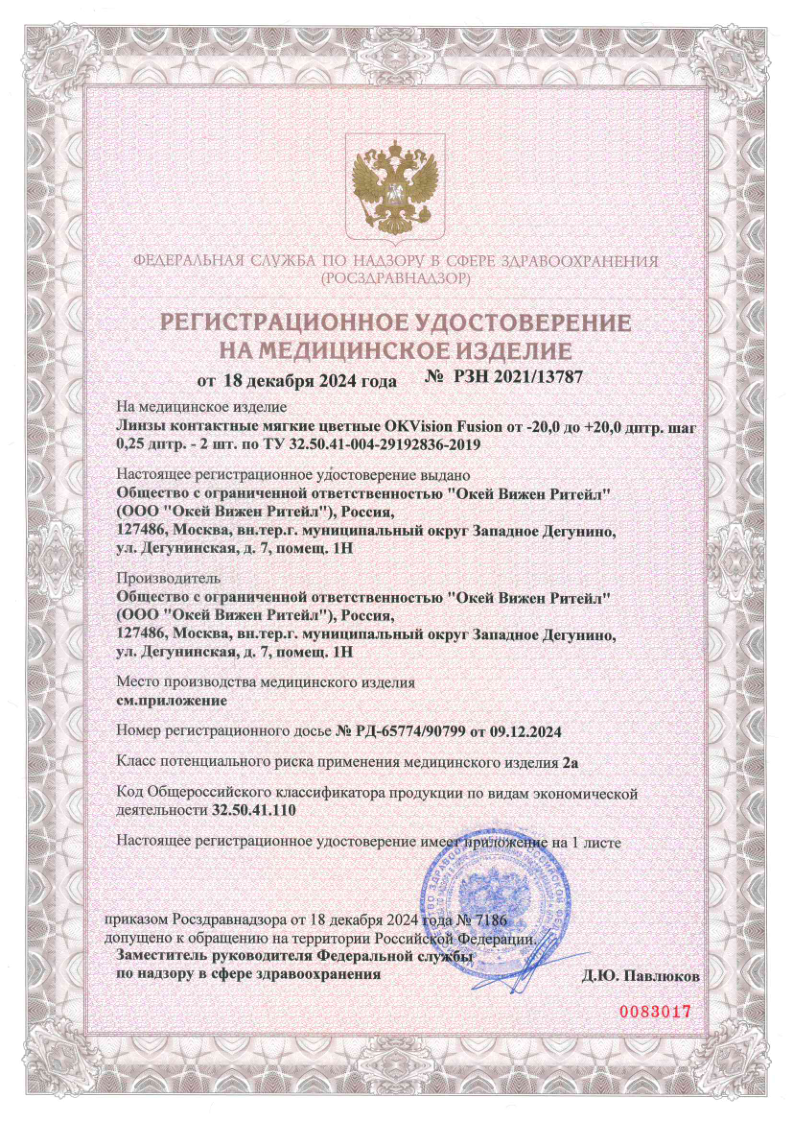 • Технология безопасности: Уникальный метод изготовления с применением послойного нанесения красителя внутри линзы, не контактирующего с глазом.